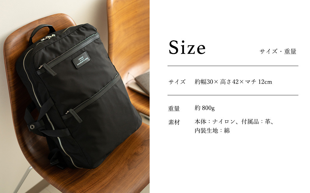 | 容量 | 本体素材:ナイロン 付属素材:革/内装:綿 Size:W30×H42×D12cm カラー:ネイビー Weigh: 800g |