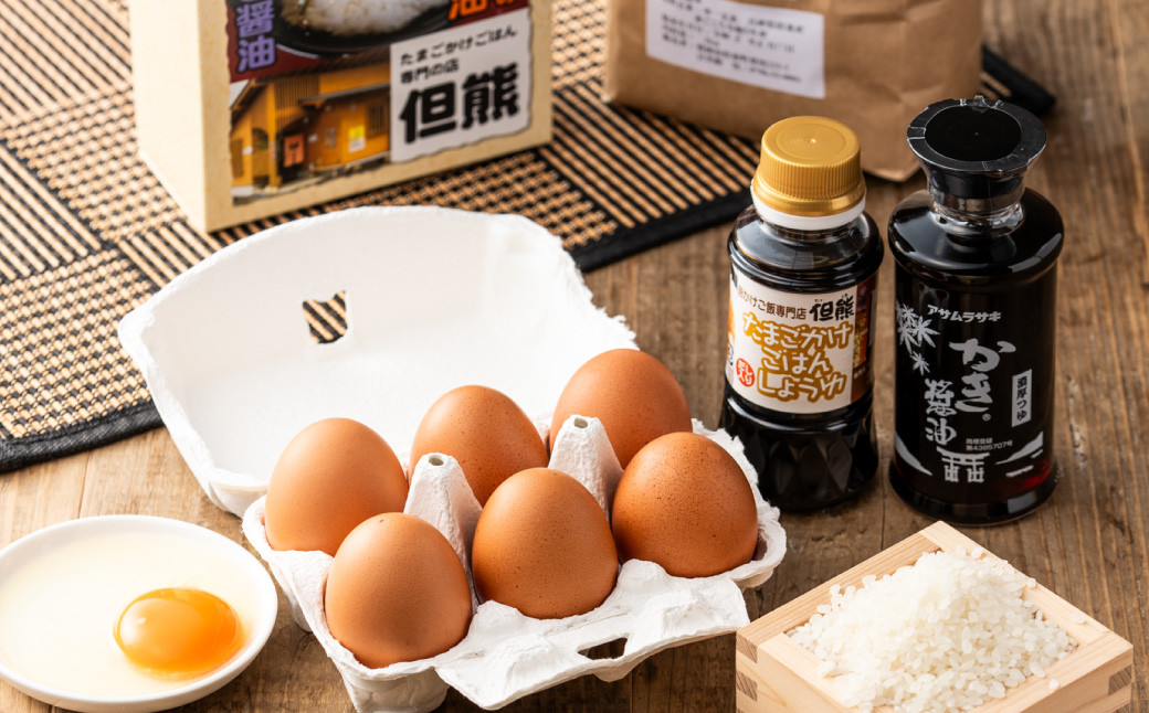 25種類の自家配合飼料で育てた鶏から産まれた卵と自家農場生産米「夢ごこち」のコラボレーション。 山の中の行列ができる店「但熊」の美味を卵かけごはんセットでお楽しみください。 ◆お問合せ先◆ お礼の品・配送に関するお問い合わせは、 (農産直売所 百笑館 TEL:0796-55-0801)までお願い致します。 ◆配達不可地域について◆ 賞味期限等の事情により、沖縄、離島へのお届けは対応しておりません。ご了承くださいませ。