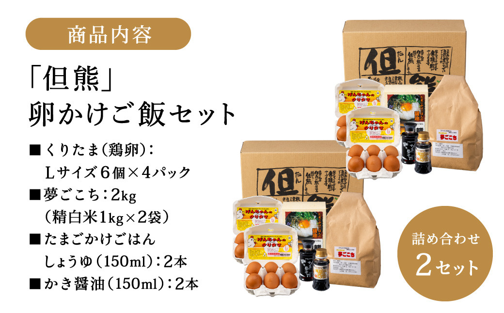 | 容量 | 【くりたま(鶏卵):Lサイズ6個×2パック、夢ごこち:1kg(精白米)、但熊たまごかけごはんしょうゆ:1本(150ml)、かき醤油:1本(150ml)】 ×2 |