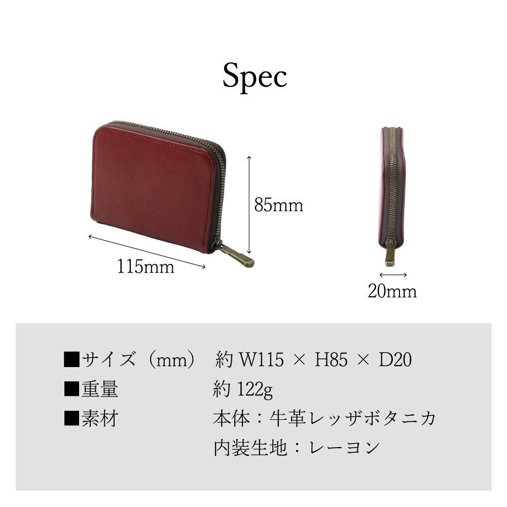 | 容量 | 本体素材:牛革 付属素材:レーヨン サイズ:W115×H85×D20(mm) 重量:122g カラー:ワインレッド、抹茶グリーン ※プルダウンよりご希望のカラーをご選択ください。 |