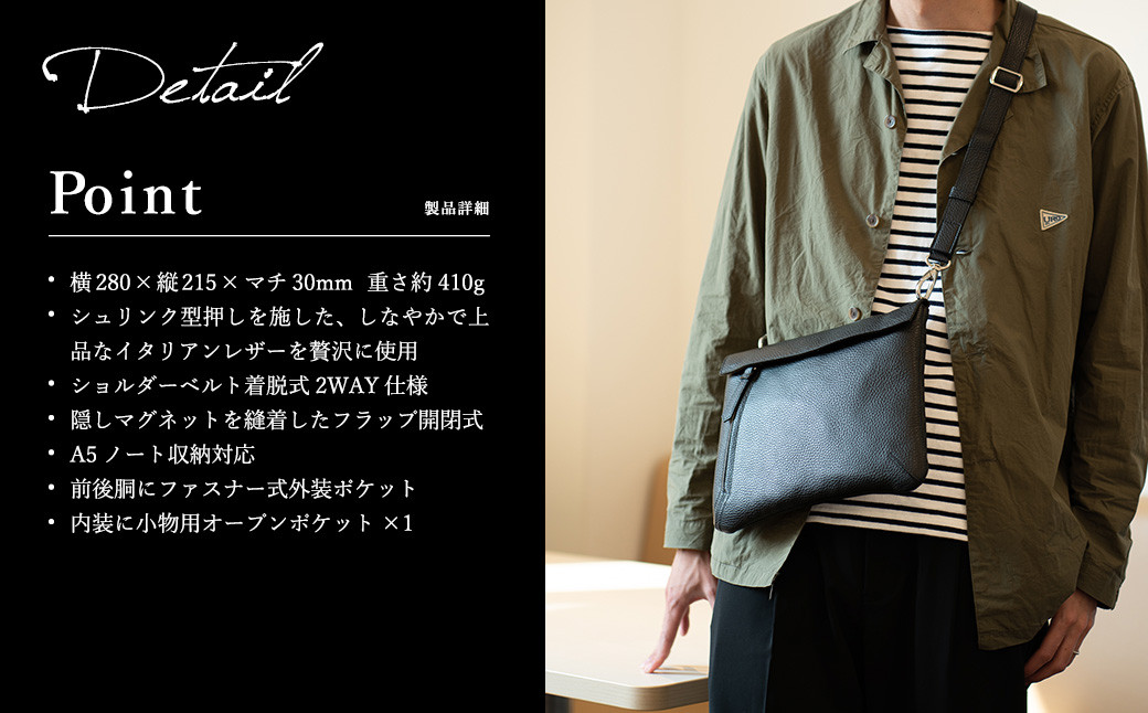 口折れタイプのデザインをテーマに、シンプルで素材感を活かしたショルダーバッグ。ポケット代わりにも、ショルダーベルトを外せばクラッチバッグやバッグ in バッグ、冠婚葬祭にも使えて便利。ショルダーベルトもレザーを使い、カジュアルの中にも高級感を感じれるモデル。前面にも背面にもファスナーポケットがあるので、細かい物の収納にも安心です。