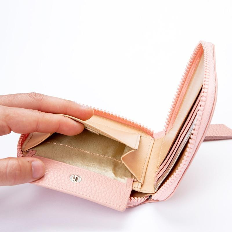 女性の手にすんなり馴染むサイズ感のラウンドミニウォレット。