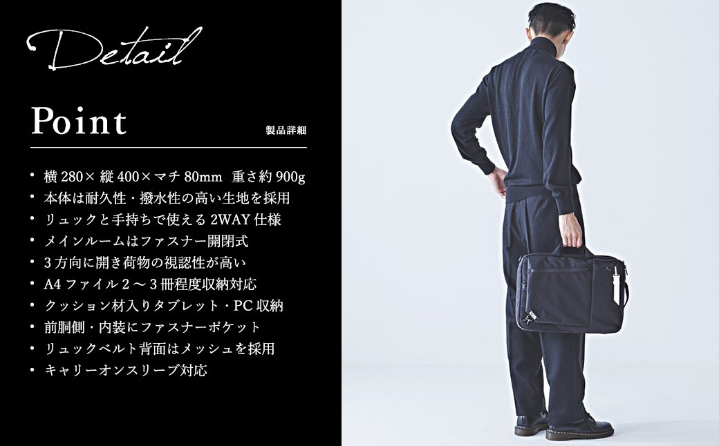 ビジネスを基本とした3WAYバックですがオンオフに使用できるデザインです。