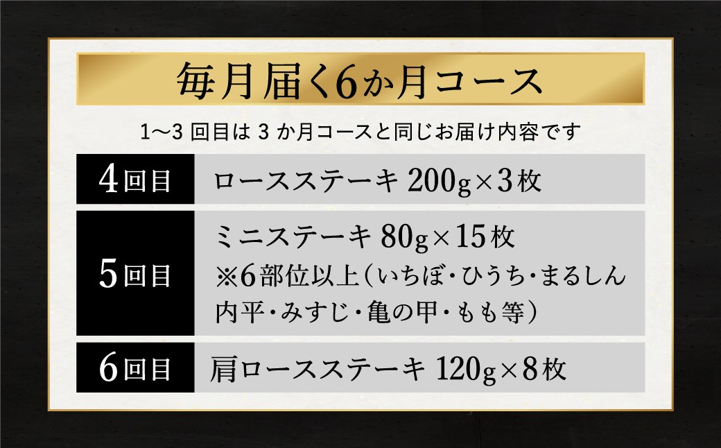 【お届け回数:全6回】はサーロイン、ヘレ、もも、ロース、希少部位、肩ロースのステーキを6か月にわたり、毎月お届けいたします。