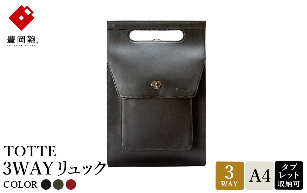 この自治体のポイントについてチョイス公式ポイント交換対象 兵庫県 豊岡市 ふるさと納税 豊岡鞄 TOTTE 3WAYリュック ブラック・ネイビーグリーン・ボルドー MBC022 / 3way バッグ レディース トート ショルダー リュック 牛革 落ち着いた色合い A4サイズ収納 肩掛け 斜め掛け トートバッグ ショルダーバッグ 高級 カジュアル ビジネス