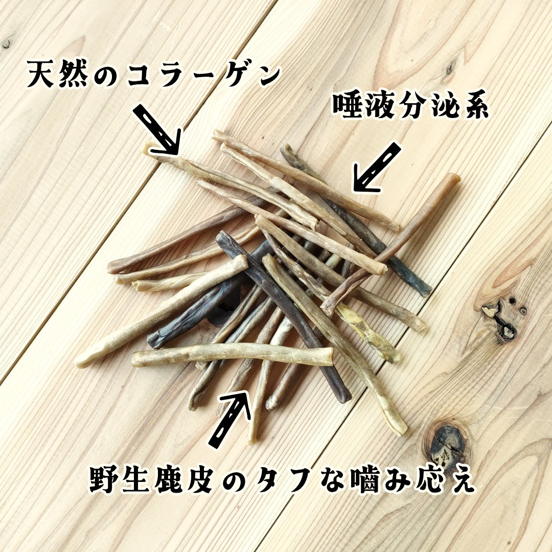 カミカミタフな噛み応え愛犬用鹿のおやつ鹿皮デンタルガム、カミカミして唾液分泌デンタルケアやストレス発散、おやつにどうぞ。