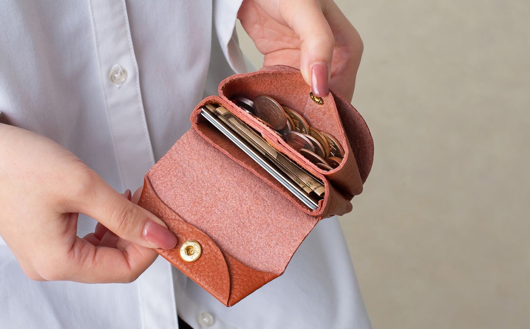 開閉はホック式で、3つのポケットにはカードや小銭、お札を折りたたんで収納できます。