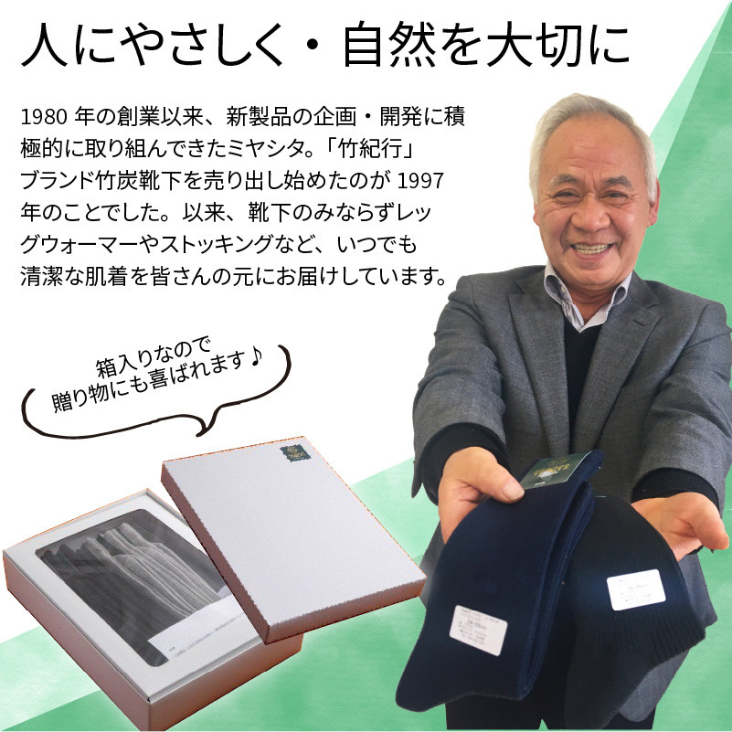 1980年の創業以来、新製品の企画・開発に積極的に取り組んできたミヤシタ。「竹紀行」ブランド竹炭靴下を売り出し始めたのが1997年のことでした。以来、靴下のみならずレッグウォーマーやストッキングなど、いつでも清潔な肌着を皆さんの元にお届けしています。