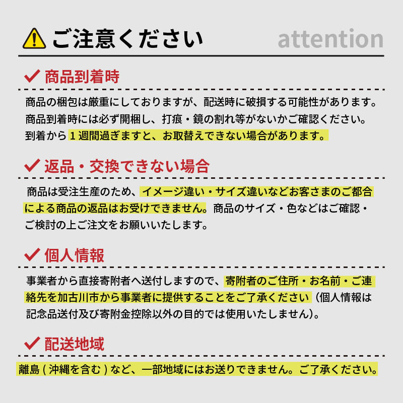 記念品の配送先を寄附者様と異なる方に設定する場合、トラブルを避けるためお送り先に「加古川市ふるさと納税の記念品が届く」旨をお伝えください。