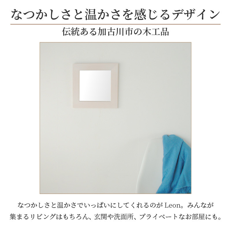 《SENNOKI Leonシリーズ》 加古川の流れを利用した上流からの木材運搬で栄えた加古川市の木工品。 みんなが集まるリビングはもちろん、プライベートルーム・玄関・書斎・和室にも、全ての場所をなつかしさと温かさでいっぱいにしてくれるのがLeonの魅力♪ 市内の自社工場で企画・製造・梱包までを一貫生産。 ご注文を受けてから製造を開始するセミオーダーで、おひとりおひとりの寄附者様のためにお作りして、出来立ての商品をお届けします。 一品一品まごころ込めて製造した商品です。 木枠は3色からお選びいただけます。 ・ブラウン ・ナチュラル ・センノキホワイト ◆返礼品お届けについて◆ 12月ご申請の方は、お届けまでに2か月程かかる場合がございます。予めご了承ください。 ※画像はイメージです。 【商品詳細】 ●商品全形サイズ:33cm×高さ33cm×奥行2cm ●ミラーサイズ:幅23cm×高さ23cm ●ミラー厚み:3mm(飛散防止効果有り) ●材質:天然木ツガ材 ●商品重量:約500g 【注意事項】 ※商品の梱包は厳重にしておりますが、商品到着時には必ず開梱し、 打痕・鏡の割れ等がないかご確認ください。 ※到着から1週間過ぎますと、お取替えできない場合があります。 ※沖縄・離島など、一部地域にはお送りできません。 【地場産品類型】 3 【類型該当理由】 市内の工場にて、製材・研磨・塗装・組み立て等、製品化に至るまでの大半の工程を行っているから