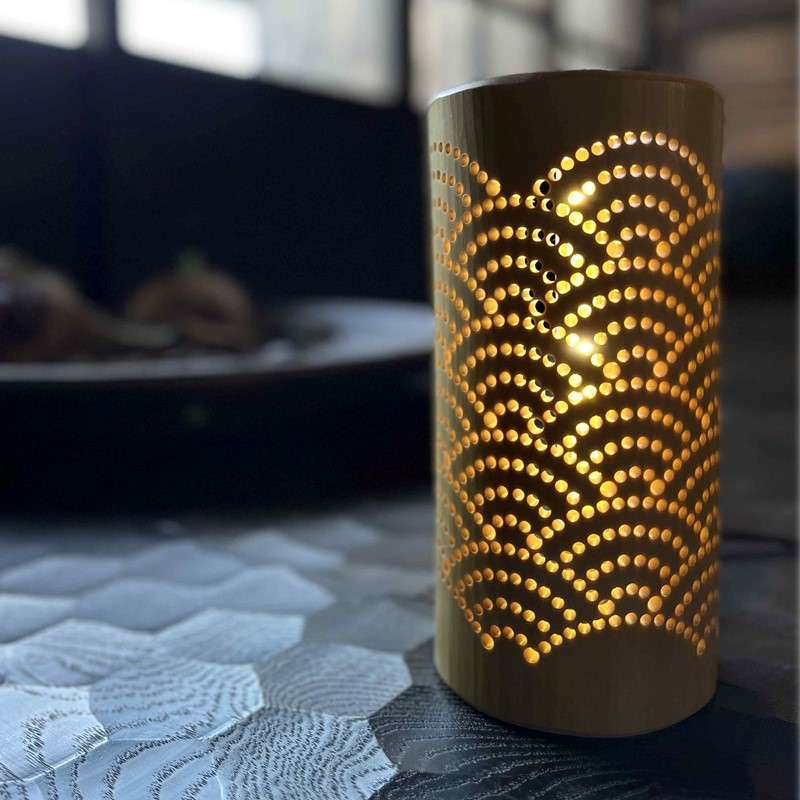 兵庫県加古川市の竹林から裁断した竹に職人の手による加工を施した、手乗りサイズの間接照明です。