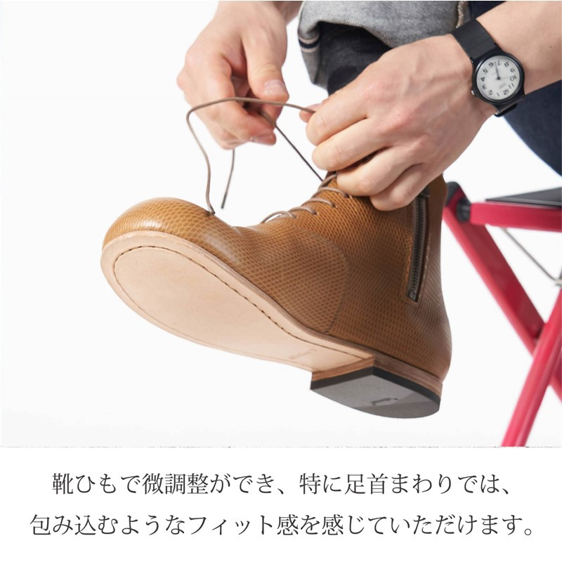 脱ぎ履きのしやすさを考慮して、内側にファスナーを取り付けております。(※ファスナーを下げることに加えて、靴ひもを緩めて足入れできる、レースアップタイプのブーツです)