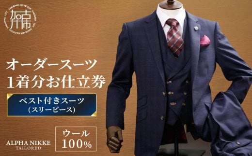 ビジネスシーンにも活躍するオーダースーツ仕立券1着分をお届けします。 タフで軽い生地と抜群の着心地。 着心地と実用性を兼ね備えたウール・ポリエステルの混紡生地を使用しオーダーのフィット感はそのままに型崩れが少ないビジネスにピッタリのスーツです。 【利用可能店舗】 ●ニッケパークタウン加古川店 〒675-0066 兵庫県加古川市加古川町寺家町173-1 ニッケパークタウン本館2F TEL:079-497-5800 FAX:079-497-5801 営業時間:10:00~20;00(年末12/31は18:00まで) 年中無休(年2回不定休) ●アルファニッケ大阪店 〒541-0048 大阪府大阪市中央区瓦町3丁目3-10 日本毛織本社ビル1階、東側の角 TEL:06-6202-5026 FAX:06-6222-2597 営業時間:月~土 9:30~18:00 定休日:日曜祝日及び年末年始、GW、お盆期間 ※店舗専用駐車場はございません。 ※画像はイメージです。 【注意事項】 使用期限:1年以内 ニッケパークタウン加古川店またはアルファニッケ大阪店で利用可能。 店舗まで採寸にお越しいただくことが難しい場合は、スーツをお送りいただくことでの採寸も可能。 採寸から納品まで約4週間。 【地場産品類型】 3 【類型該当理由】 加古川市内の工場にて原毛から織られた生地を使用し、国内有数の縫製工場において生産されたオーダースーツ 【注目キーワード】 オーダースーツ ビジネス 送料無料 オーダー 成人式 入社式 ギフト プレゼント 贈り物