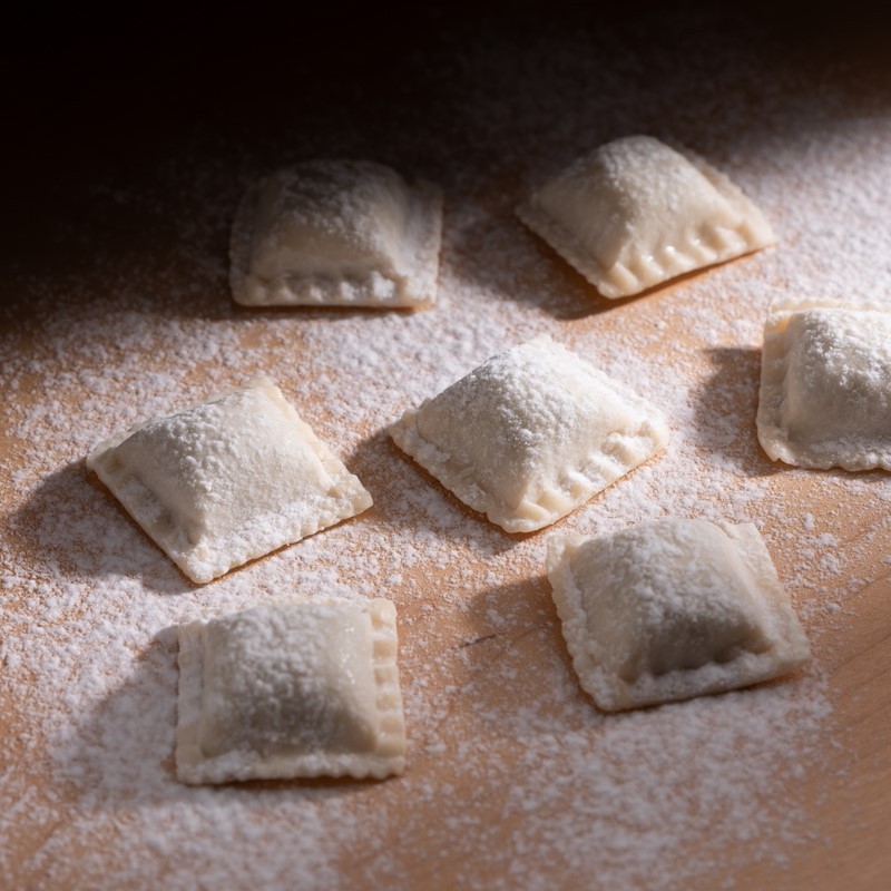 もちっとした食感の生パスタ生地に、具材を包み込んだ一口サイズのラビオリは、1個あたり約10g。