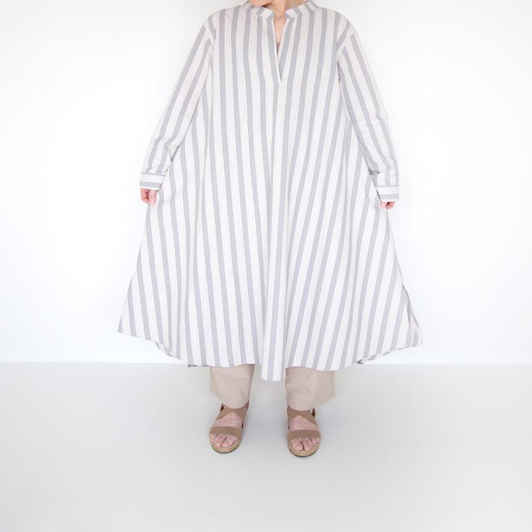 素材の上質さや、シルエットの美しさをお楽しみいただくため、敢えてデザインはシンプルに。爽やかなオリジナルのストライプ柄で、たっぷりとしたシルエットもスッキリ着こなしていただけます。