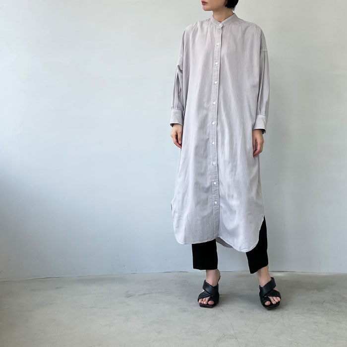 生地からこだわった播州織の魅力が詰まったオシャレな1着 播州織綿麻キュプラ7分袖ワンピース レディース バンドカラー スタンドカラー シャツワンピース (55-14)