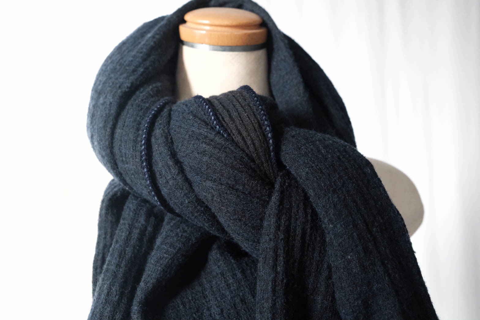 両端はブランケットステッチで仕上げ、巻いた時のアクセントにも。落ち着いた色合いがシックな印象。コットンとウール、両方の素材を感じていただける一枚です。
