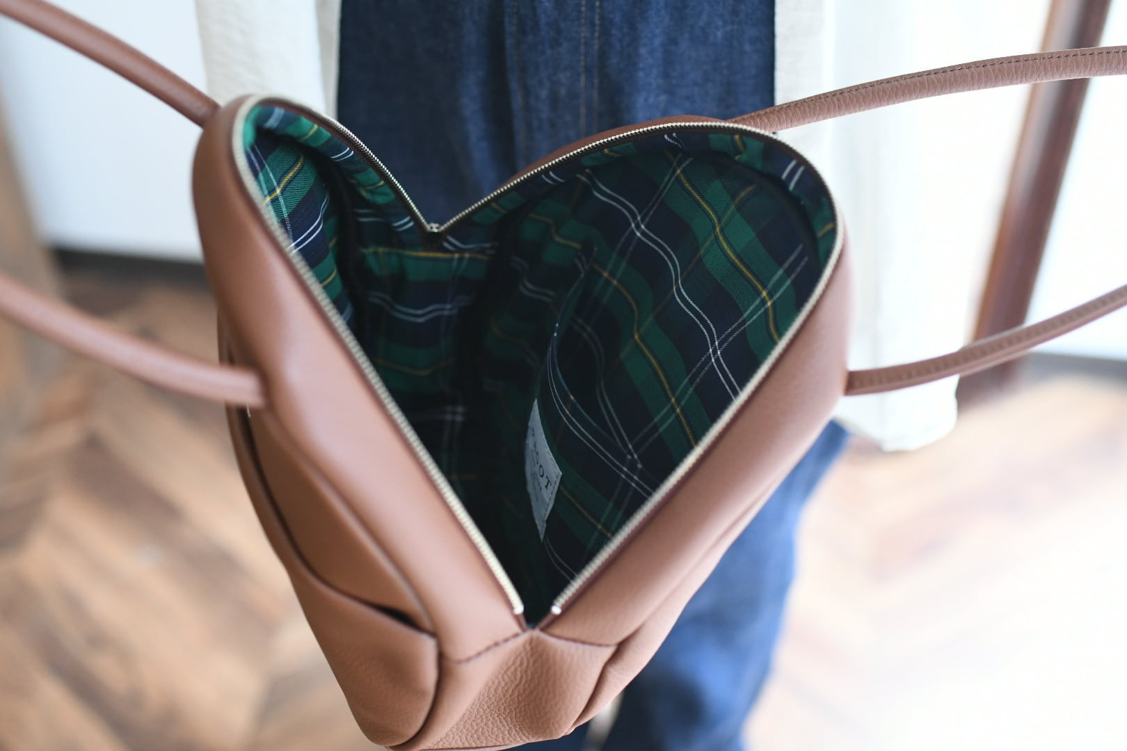 細めのハンドルは肩がけもできる長さにしています。厚めのコートでも安心なように縫込み位置も幅広にしました。