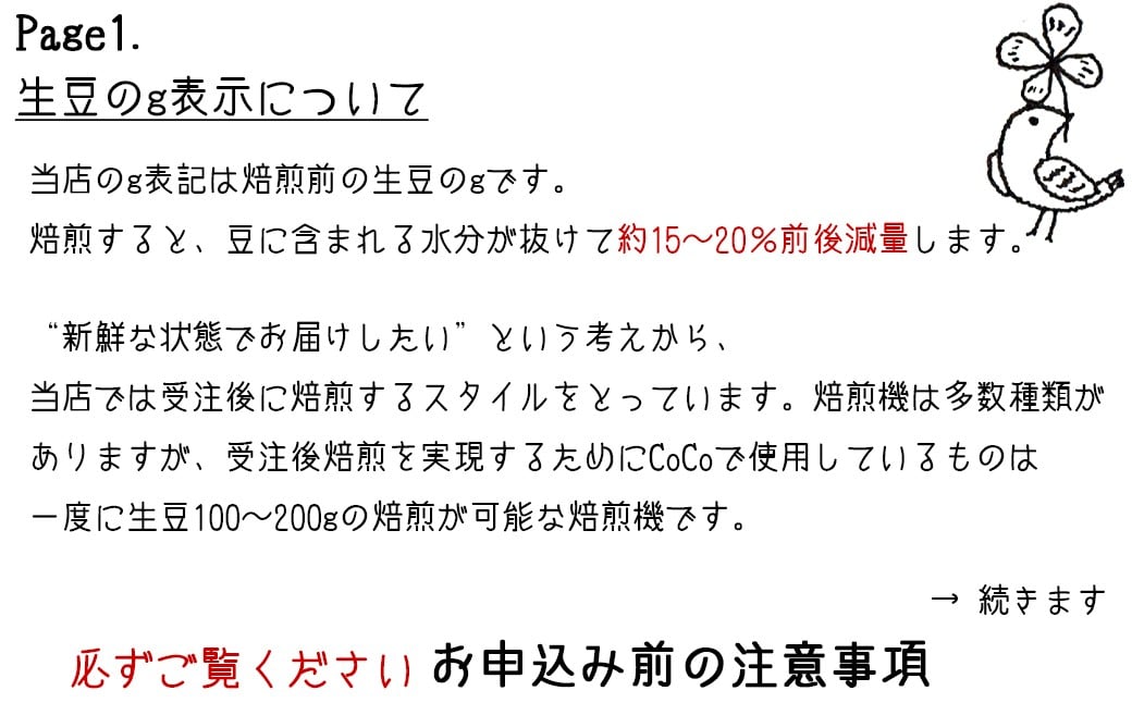 | 容量 | 【発送日焙煎珈琲100g(生豆時)×2種】 ・ペルー マチュピチュ(中煎) ・クイーンショコラ(浅煎) 【※焙煎後の目方について】 当店は受注後に生豆から焙煎するスタイルの為、表示は生豆のグラムとなっております。その為、焙煎すると水分が抜けて15~20%程度(焙煎度合いによって変化)減量します。 その他ご注文前の注意事項を画像にもまとめております。ご購入前に必ずご確認いただき、ご納得の上でご検討くださいませ。 |