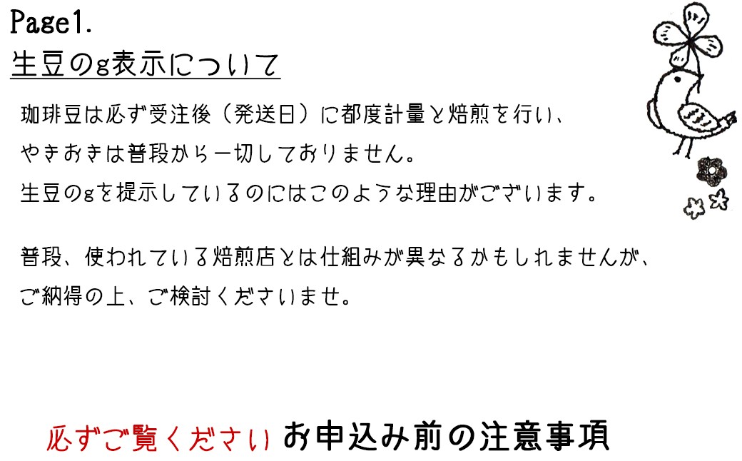 | 消費期限 | 賞味期限:焙煎日(=発送日)から1ヵ月程度を推奨 【保管方法】 高温・多湿・直射日光を避け、涼しい場所に保管してください。 珈琲を入れている袋は、袋内のガスを排出するよう特殊な加工がされていますが、ご自宅に届いた後は、密閉容器等に移しての保管をお勧めいたします。 |