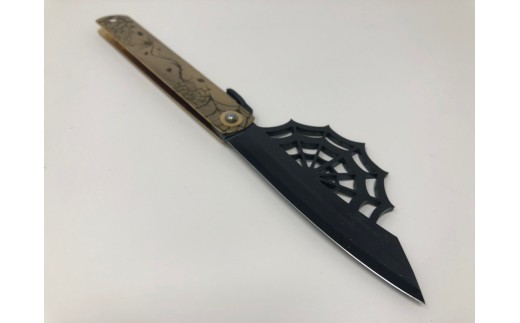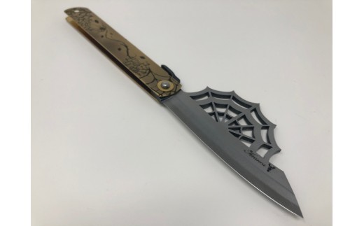 百年の伝統を後世に伝える『日本屈指の金物のまち兵庫県三木市』の肥後守ナイフとゴシックデザインのコラボレーション作品です。 刃を蜘蛛の巣をモチーフにしたデザインに輝きのある磨き仕上げになっています。 鞘はアンティークゴールド仕上に裏・表で異なる蜘蛛の巣のデザインが刻まれています。 材質は安来鋼青紙を使用。切味・耐久性も素晴らしく、長く愛用できる仕上げとなっています。 刃材質:青紙割込(安来鋼) 刃長:約95mm 刃厚:約3mm 鞘長:約120mm 鞘材質:真鍮 重さ:約90g ※注意事項 ・1本1本手作りの為、おおよその長さ、重さになります。