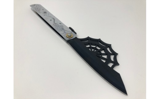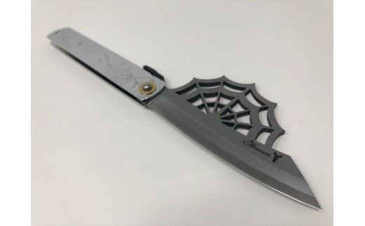 百年の伝統を後世に伝える『日本屈指の金物のまち兵庫県三木市』の肥後守ナイフとゴシックデザインのコラボレーション作品です。 刃を蜘蛛の巣をモチーフにしたデザインに輝きのある磨き仕上げになっています。 鞘はシルバー仕上に裏・表で異なる蜘蛛の巣のデザインが刻まれています。 材質は安来鋼青紙を使用。切味・耐久性も素晴らしく、長く愛用できる仕上げとなっています。 刃材質:青紙割込(安来鋼) 刃長:約95mm 刃厚:約3mm 鞘長:約120mm 鞘材質:鉄クロームメッキ 重さ:約90g ※注意事項 ・1本1本手作りの為、おおよその長さ、重さになります。