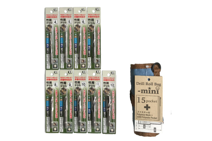 | 容量 | ○竹用ドリル:9本 ・4mm ・5mm ・6mm ・7mm ・8mm ・9mm ・10mm ・11mm ・12mm ○ドリルロールバッグmini |