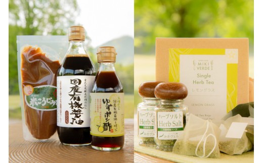 【三木市×多可町】ハーブセットと国産有機醤油、ゆずポン酢、米…