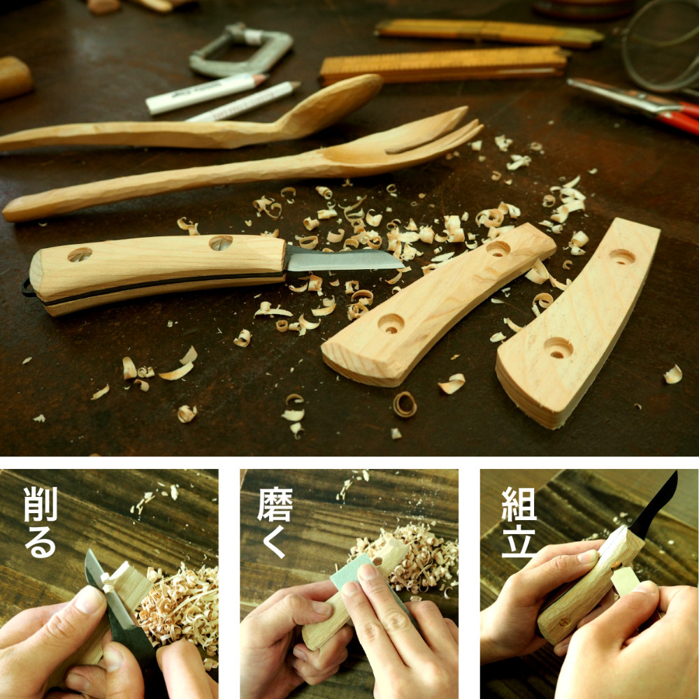 ナイフでハンドル材を好きな形に削り、サンドペーパーで仕上げます。初めての方でも手軽に自分だけのオリジナルナイフを作ることができます。職人がひとつひとつ手で研ぎあげた本格派のナイフはまさに一生モノ。木削りをはじめ、工作全般に使えるクラフトナイフです。
