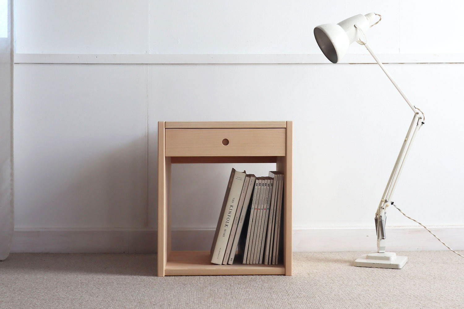 ソファやベッドの横に引出しや本が仕舞えるところがほしいという発想をシンプルにカタチにしてみました。