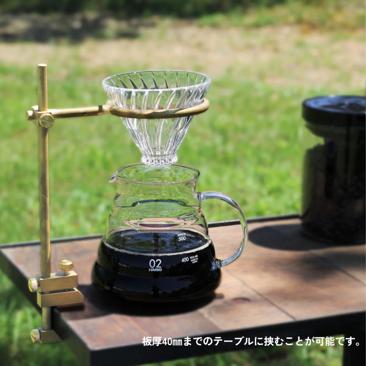 分解できて持ち運びが便利なドリッパースタンド。テーブルに挟んで使う新感覚アイテムです。板厚40mmまでのテーブルに挟むことができます。インテリアにも映える重厚なデザインで、真鍮のビンテージ感を楽しめます。高さ、前後調節ができる優れものです。