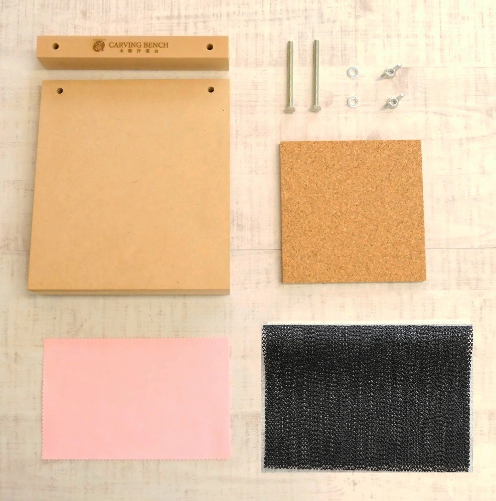 【立体木彫制作に向けた専用作業台!】 当て板の高さを木彫作業の使い勝手を考え35mmの高さに設定。 盤面サイズ縦横200mmの正方形。 カトラリー制作や動物彫刻などに! 【当て板が固定用クランプに!】 当て板のねじを緩めれば固定用クランプとして機能。 手で押さえにくかったスプーンなどが一層彫りやすく。 すべり止めマット併用で手前に引いて彫るのにも対応。 付属のコルク板の使用で彫刻刀の刃先も傷めにくくなる。 【シャープニングクロス使用で彫刻刀刃先をリフレッシュ!】 付属のピンク色の布は研磨効果のあるシャープニングクロス。 クランプで固定し、切れ味の落ちた彫刻刀を磨けば 多少の欠けなら修正出来、切れ味をリフレッシュ。