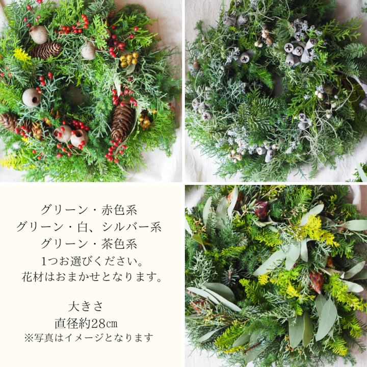 | 容量 | ○クリスマスリースキット ・縦28cm×横28cm ・カラー:グリーン・赤色系、グリーン・白+シルバー系、グリーン・茶色系の3色からお選びください。 ○原材料 ・リースの土台、ワイヤー、作り方説明書 |