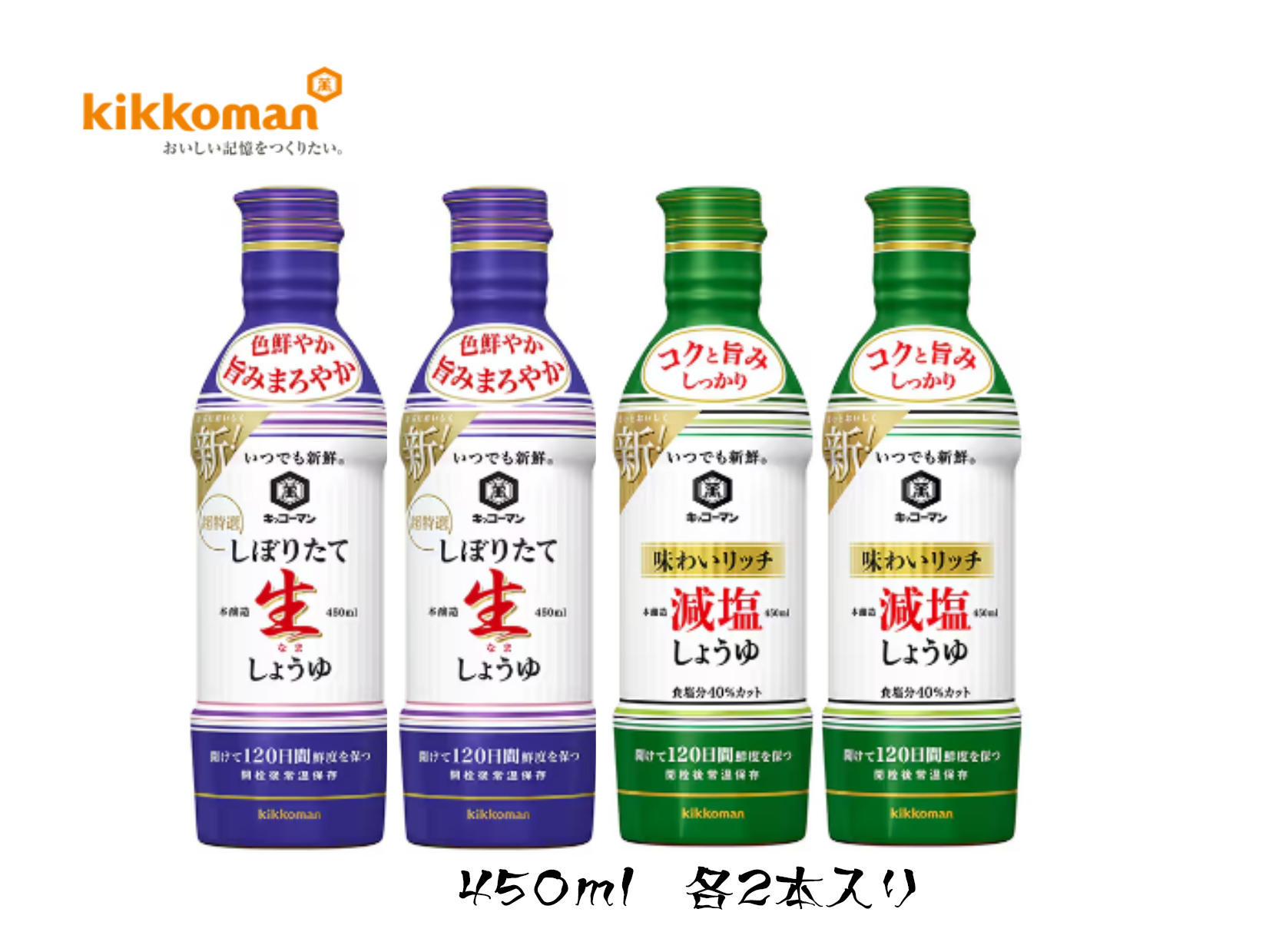 | 容量 | キッコーマン いつでも新鮮 しぼりたて生しょうゆ 450ML× 2本 キッコーマン いつでも新鮮 味わいリッチ減塩しょうゆ 450ML 2本セット |