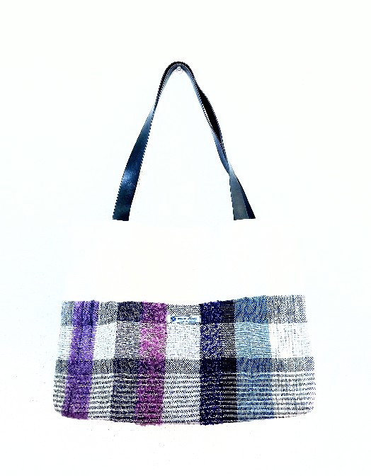 トートバッグ 手織り(さをり織り)×播州織白デニムのトートバッグ パープル系 職人技 手織り カラフル やさしい風合い 個性豊か