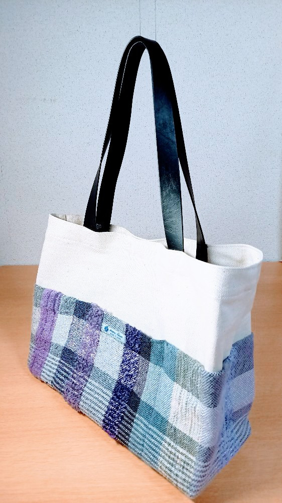 その手織り『さをり織り』と、兵庫県北播磨地区の地場産業の『播州織』のデニム生地と組み合わせて製作した大きめ「トートバッグ」です。