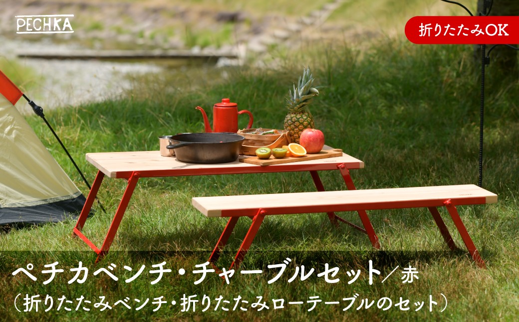 | 容量 | サイズ 『ペチカベンチ』 天板幅 約100㎝(脚幅 約110㎝) 高さ 約25㎝ 天板奥行 約24cm 折りたたみ時厚さ 約3cm 『チャーブル』 天板幅 約91cm(脚幅 約105cm) 高さ 約35cm 天板奥行き 約45cm 折りたたみ時厚さ 約3cm |