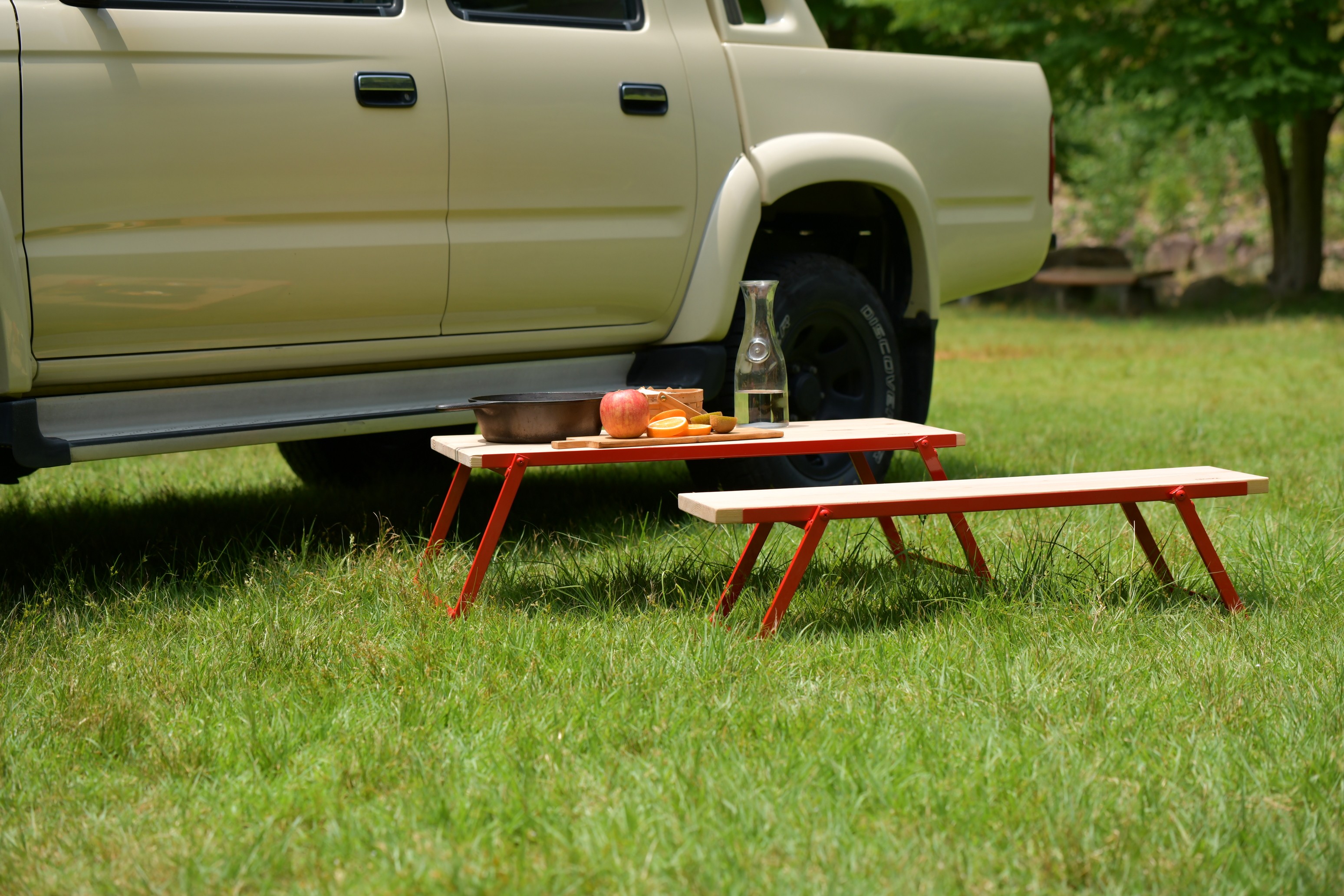 木材の天板とアイアンの脚を組み合わせた、折りたたみ式のベンチとテーブルのセットです。