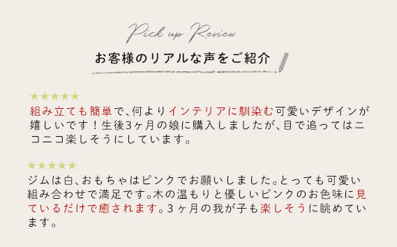 HOPPLらしい天然木を使用したリングとオリジナルボタンはナチュラルな仕上がりとなっており、ベビージムセットとあわせて使えば、赤ちゃんの可愛らしい遊びの空間が出来上がります。