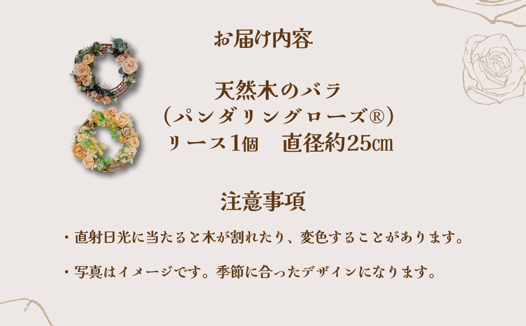 | 容量 | 天然木のバラ(パンダリングローズ?)リース1個 直径約20㎝ |