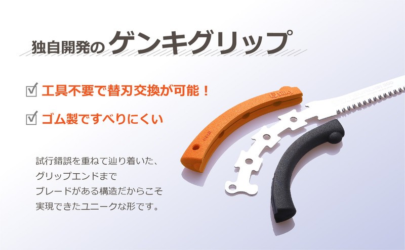 ツルギ万能目400は、従来の竹挽鋸の常識を覆す「万能目」と「厚い刃」で、竹の伐採に威力を発揮します。ツルギシリーズの中でも厚い鋼材を使用しており、堅い竹の繊維にも負けません。【スリムな鋸刃】が抵抗を軽減し、女性でも一度刃が入ればザクザクと脅威のスピードで切断できます。特殊な目立て【未来目】は、複雑に絡んだ縦・横・斜めの繊維を断って削り出す刃で、あらゆる方向からの切断が可能です。強靭な鋼にするため、刃先表面にのみ【高硬度の衝撃焼入れ】を施すことで、靭性・耐摩耗性が高くなり、最高の切れ味が長く続きます。【ゲンキグリップ】は替刃交換に工具が必要なく、刃を挟み込むだけでOK。