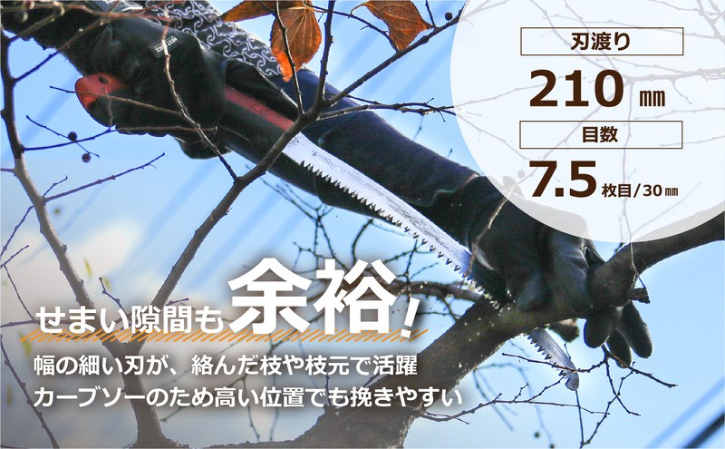 ツルギカーブは、狭所の剪定・枝打ちを可能とした【スリムなカーブソー】。鋸刃がカーブしているので力の入りにくい不安定な場所(脚立の上など)でも真っ直ぐ引くだけでしっかりと食い込み、切断がとてもスピーディに行えます。特殊目立ての【未来目】は、複雑に絡んだ縦・横・斜めの繊維を断って削り出す刃で、あらゆる方向からの切断が可能になりました。また、シルキー独自の鏡面研磨による【アサリなし】で切り口は絹のようにツルツルになり、雨水がよく乾き、皮巻きを早め、木を病気や腐りから守ります。強靭な鋼にするため、刃先表面にのみ【高硬度の衝撃焼入れ】を施すことで、靭性・耐摩耗性が高くなり、最高の切れ味が長く続きます。【ゲンキグリップ】は替刃交換に工具が必要なく、刃を挟み込むだけでOK。
