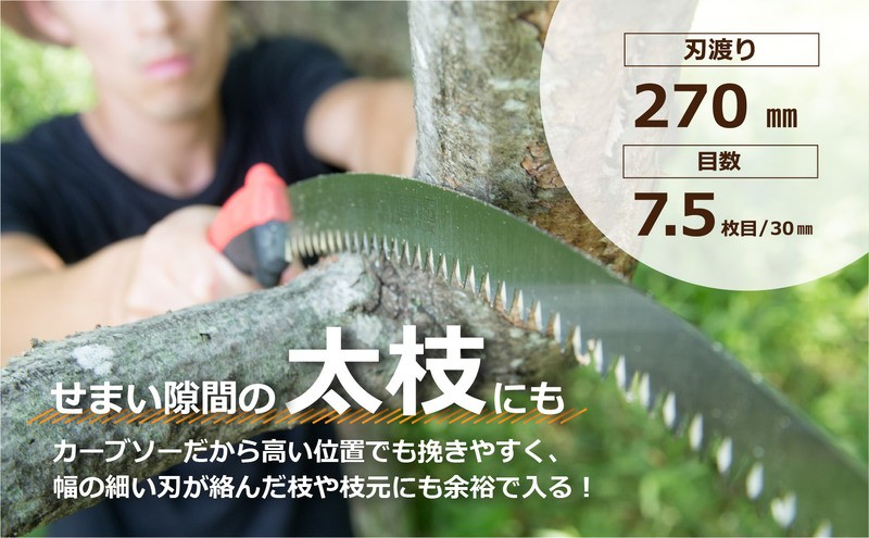 ツルギカーブは、狭所の剪定・枝打ちを可能とした【スリムなカーブソー】。鋸刃がカーブしているので力の入りにくい不安定な場所(脚立の上など)でも真っ直ぐ引くだけでしっかりと食い込み、切断がとてもスピーディに行えます。特殊目立ての【未来目】は、複雑に絡んだ縦・横・斜めの繊維を断って削り出す刃で、あらゆる方向からの切断が可能です。また、シルキー独自の鏡面研磨による【アサリなし】で切り口は絹のようにツルツルになり、雨水がよく乾き、皮巻きを早め、木を病気や腐りから守ります。【ゲンキグリップ】は替刃交換に工具が必要なく、刃を挟み込むだけでOK。