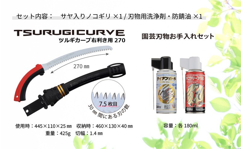 | 容量 | 【シルキーツルギカーブ右利き本体270】×1 [刃渡り] 270mm [目数] 7.5枚目/30mm [刃厚] 1.8mm [切幅] 1.4mm [重量] 425g [収納時] 460×130×40(mm) [使用時] 445×110×25(mm) [仕様] カーブ刃、アサリなし、未来目、衝撃焼入、防錆めっき処理、レッグストラップ対応 [対象物] 生木(直径3cm~9cm前後) [材質] 特殊合金鋼 [製造元] 日本 【園芸刃物お手入れセット】×1 「ヤニクリーン180」 [用途] 各種刃物のヤニ・渋・接着剤の除去 [容量] 180ml [液性] アルカリ性 [成分] 界面活性剤、アルコール等 「アイアンガード180」 [用途] 各種刃物の錆防止、金属表面の除湿、回転・摺動部の浸透潤滑 [容量] 180ml [成分] 潤滑油基油 [警告]第4類第二石油類危険等級Ⅲ |