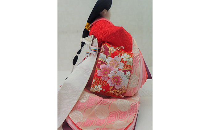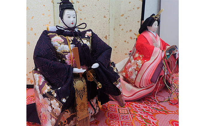御衣裳の桜刺繍柄に合わせた金襴敷でコーディネートした豪華なひな飾りです。