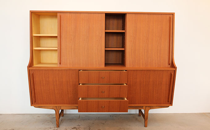 中央に飾り棚を設けています。可動棚は10枚あります。上下の引き戸、真ん中の引き出しは斜めに勾配がついており、手の込んだ作りです。