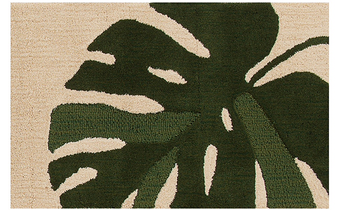 モンステラの葉を大胆にレイアウトしたモダンでナチュラルな雰囲気のインテリアマットです。