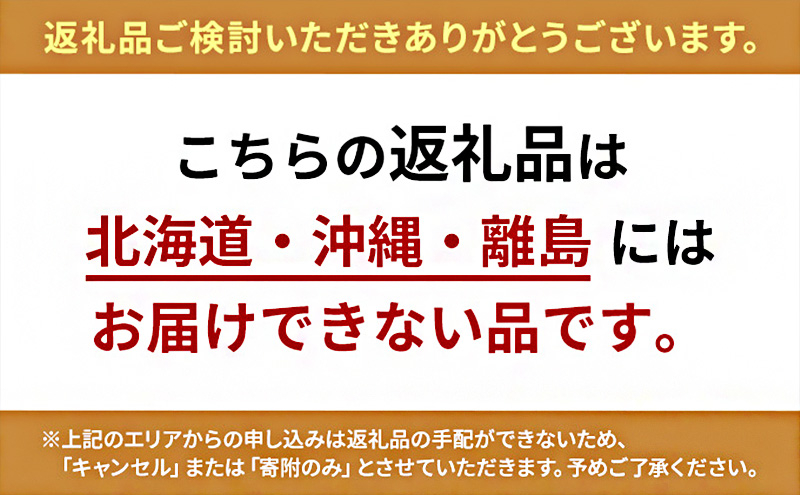 ※上記のエリアからの申し込みは返礼品の手配が出来ないため、「キャンセル」または「寄附のみ」とさせていただきます。予めご了承ください。