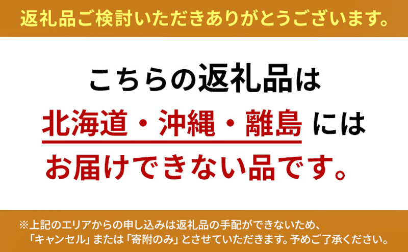 ※上記のエリアからの申し込みは返礼品の手配が出来ないため、「キャンセル」または「寄附のみ」とさせていただきます。予めご了承ください。