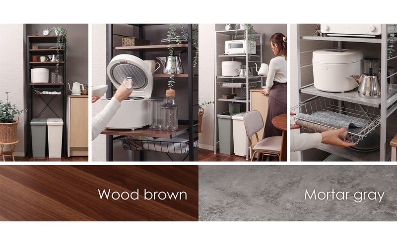 ※スライド棚には炊飯器や電気ケトルなど蒸気が出るものを設置いただくことが可能ですが、ご使用時は蒸気が上の棚板に直接当たらないように必ず棚板を前に出した状態にしてください。